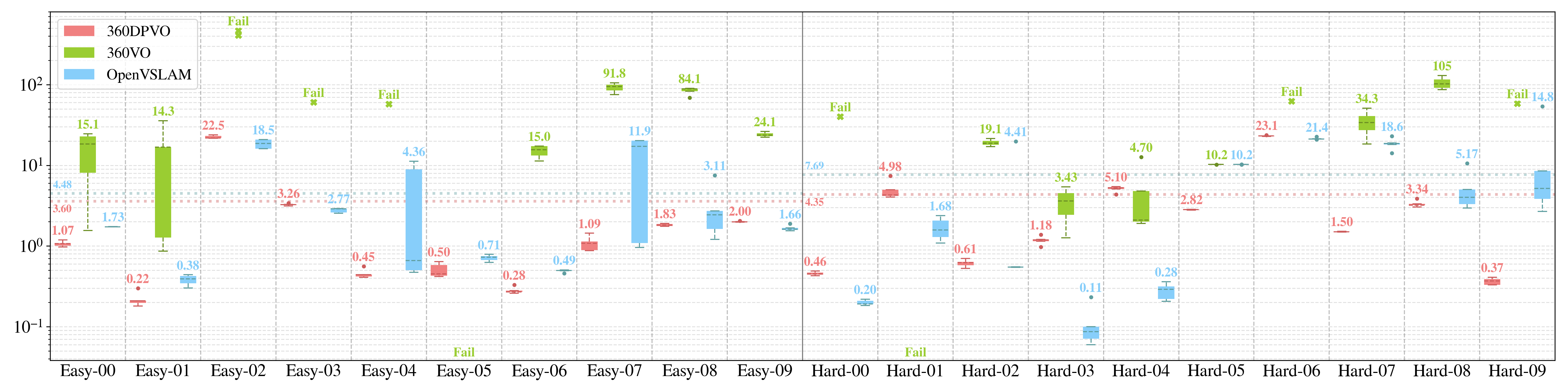 Figure I: Boxplot results of OVO methods on the 360DVO dataset. Our 360DVO runs stably with lowest variations.