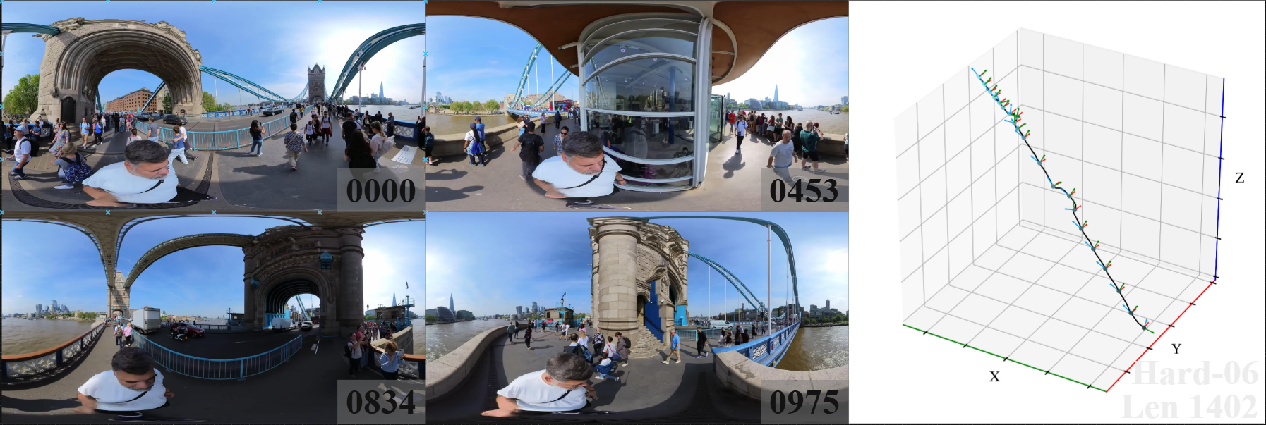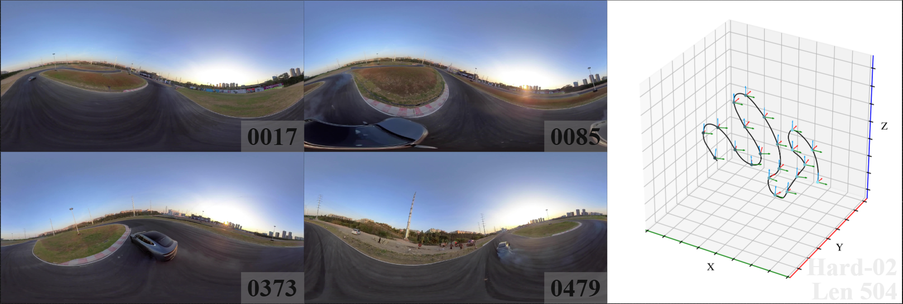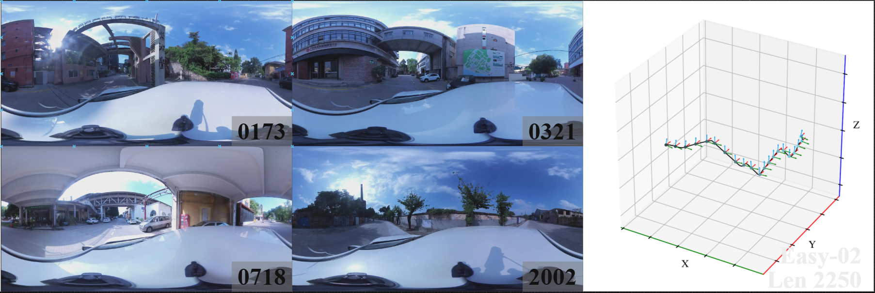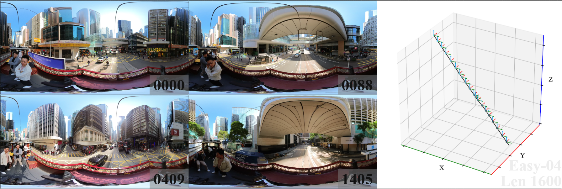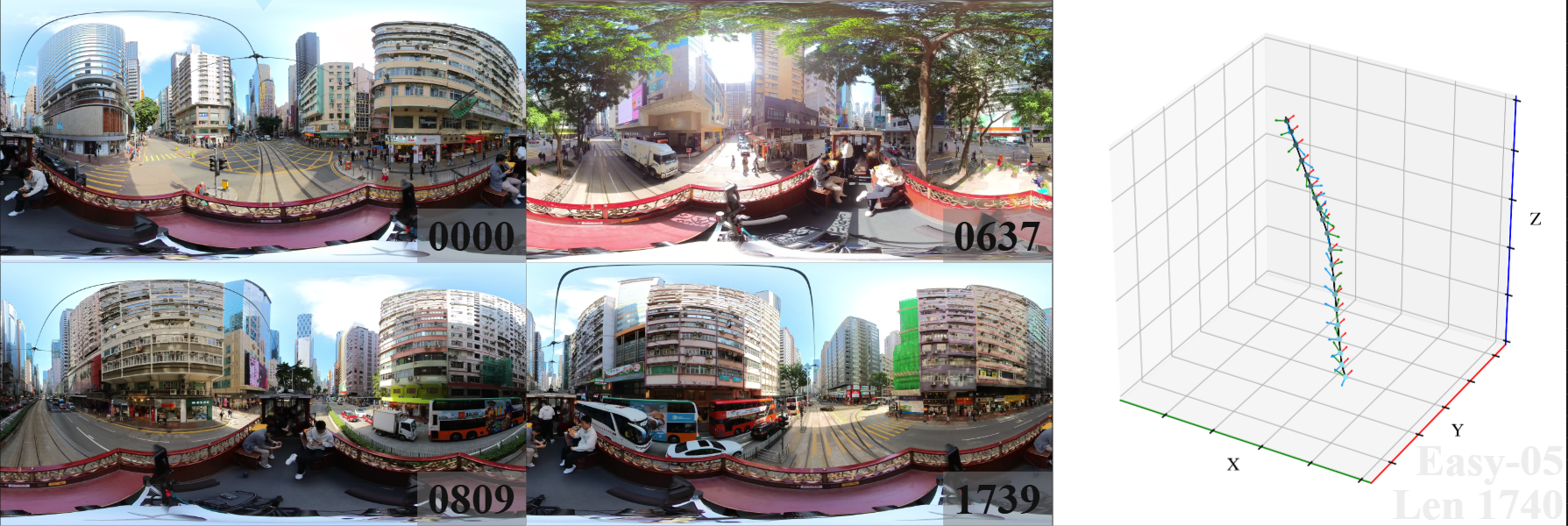 We introduce 360DVO Dataset, a large-scale real-world OVO benchmark emphasizing practical challenges across diverse environments and motions. It includes 20 sequences (~1k frames each) and all images are standardized to 3840x1920 at 10 FPS. Pseudo ground truth is reconstructed via SfM software Agisoft Metashape. To facilitate rigorous evaluation, we partition the dataset into Easy and Hard subsets (10 each) by trajectory complexity and scene dynamics, from linear, static cases to aggressive rotations, lighting shifts, and dynamic occlusions.