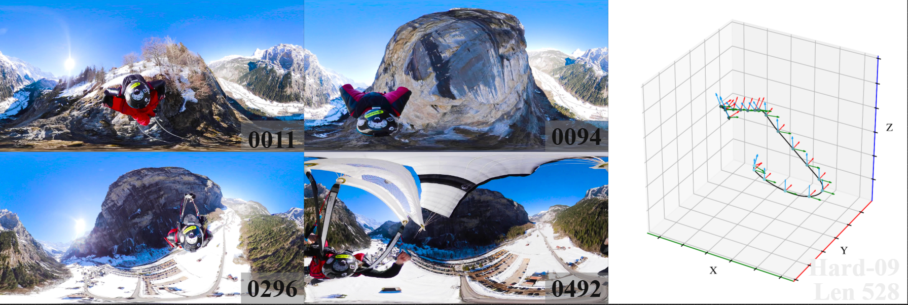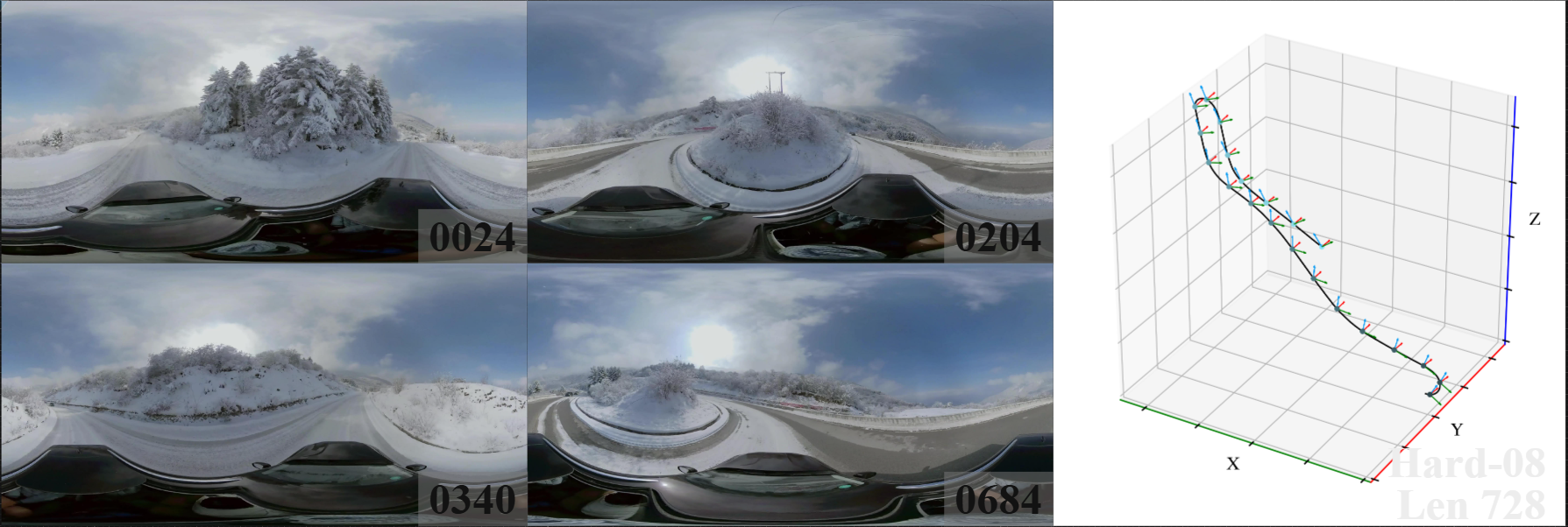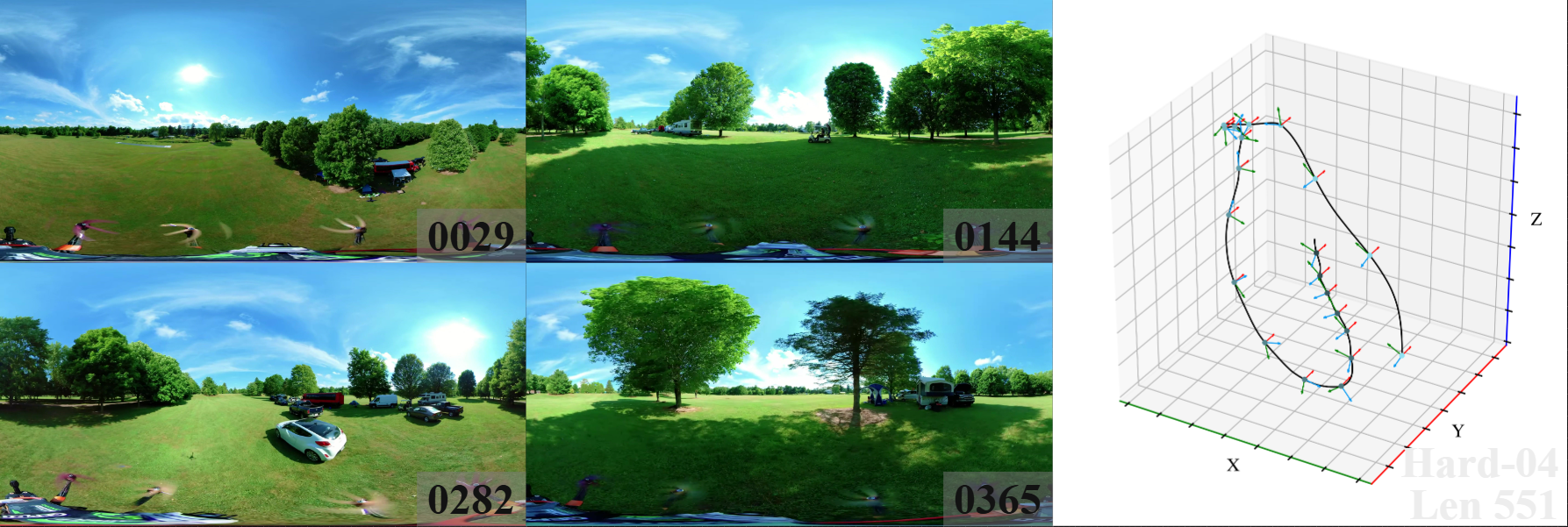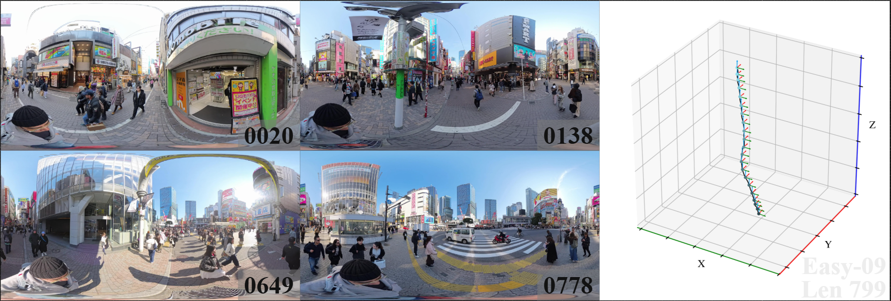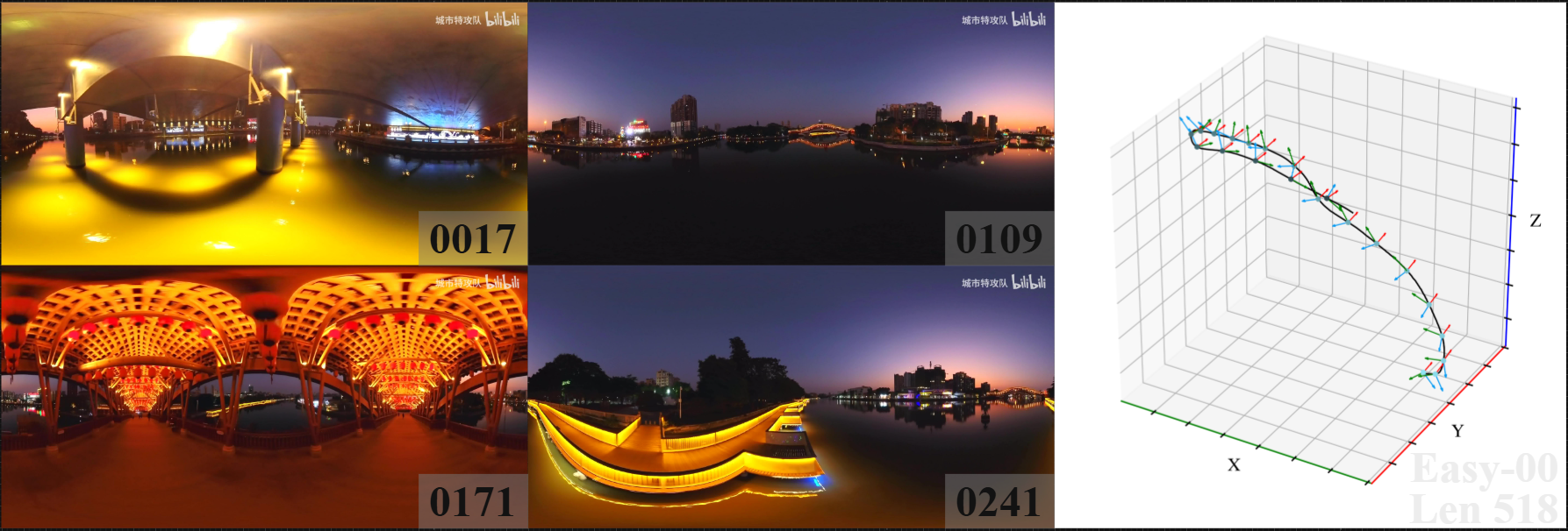 We introduce 360DVO Dataset, a large-scale real-world OVO benchmark emphasizing practical challenges across diverse environments and motions. It includes 20 sequences (~1k frames each) and all images are standardized to 3840x1920 at 10 FPS. Pseudo ground truth is reconstructed via SfM software Agisoft Metashape. To facilitate rigorous evaluation, we partition the dataset into Easy and Hard subsets (10 each) by trajectory complexity and scene dynamics, from linear, static cases to aggressive rotations, lighting shifts, and dynamic occlusions.