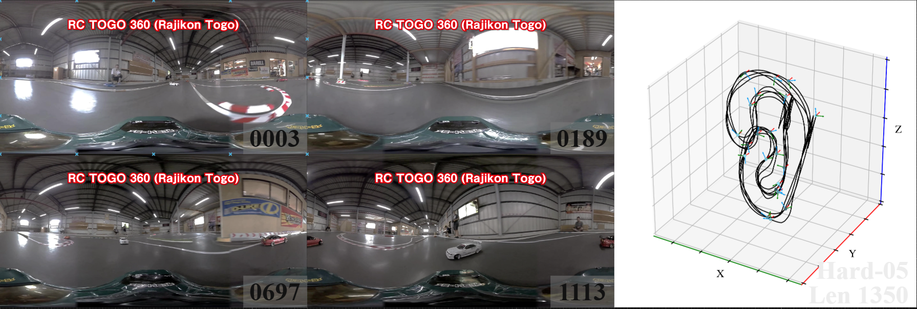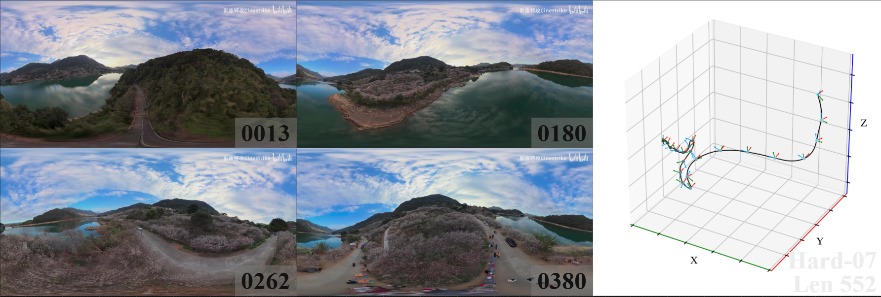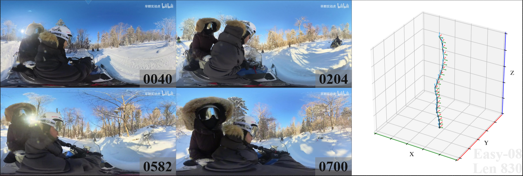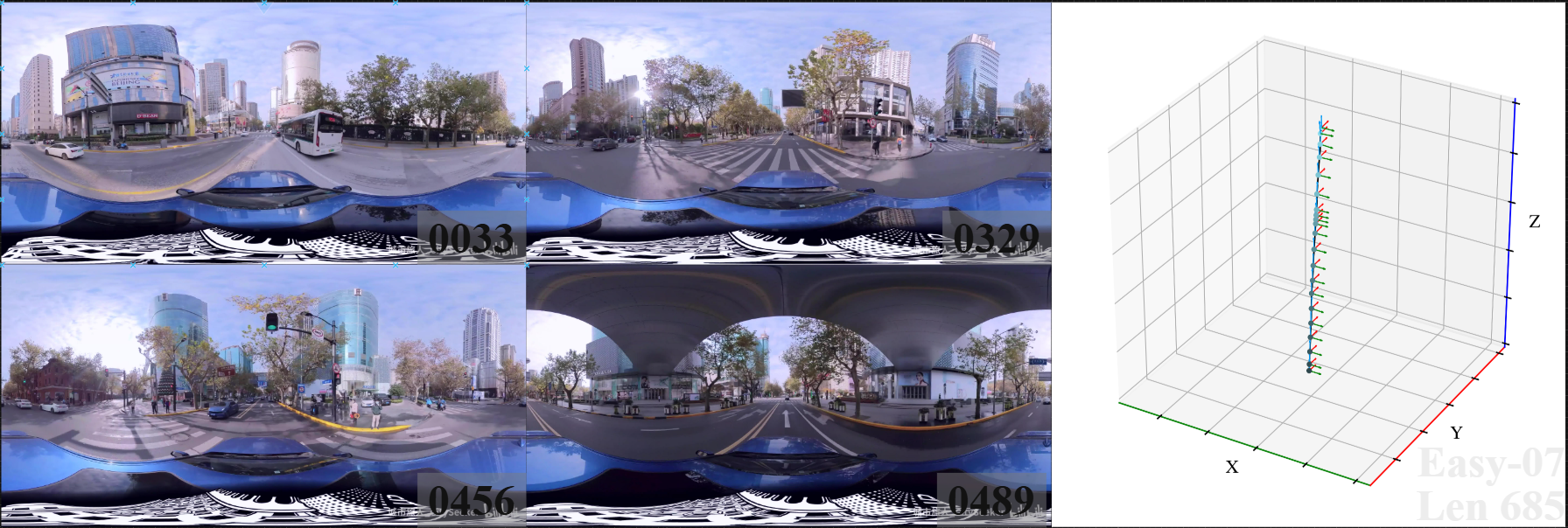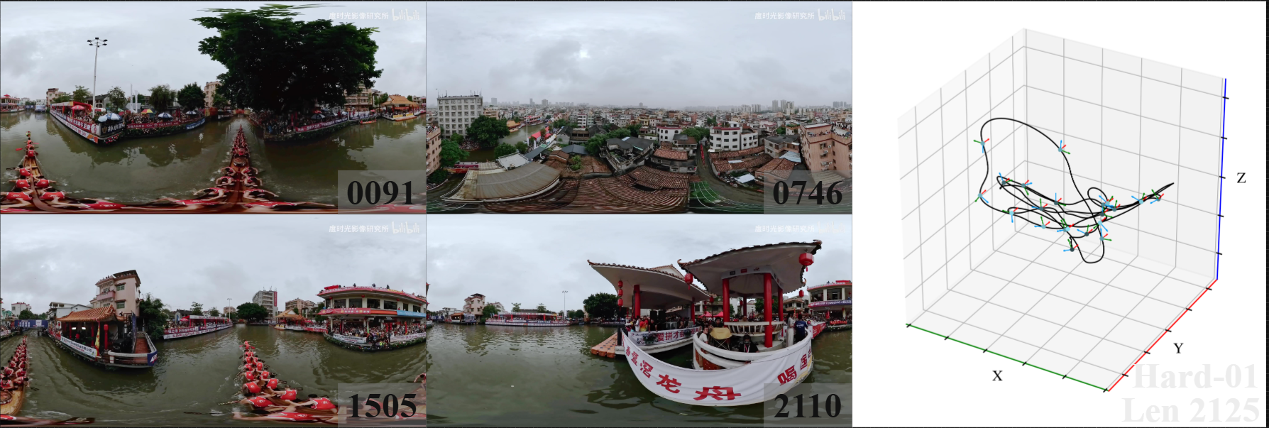 We introduce 360DVO Dataset, a large-scale real-world OVO benchmark emphasizing practical challenges across diverse environments and motions. It includes 20 sequences (~1k frames each) and all images are standardized to 3840x1920 at 10 FPS. Pseudo ground truth is reconstructed via SfM software Agisoft Metashape. To facilitate rigorous evaluation, we partition the dataset into Easy and Hard subsets (10 each) by trajectory complexity and scene dynamics, from linear, static cases to aggressive rotations, lighting shifts, and dynamic occlusions.