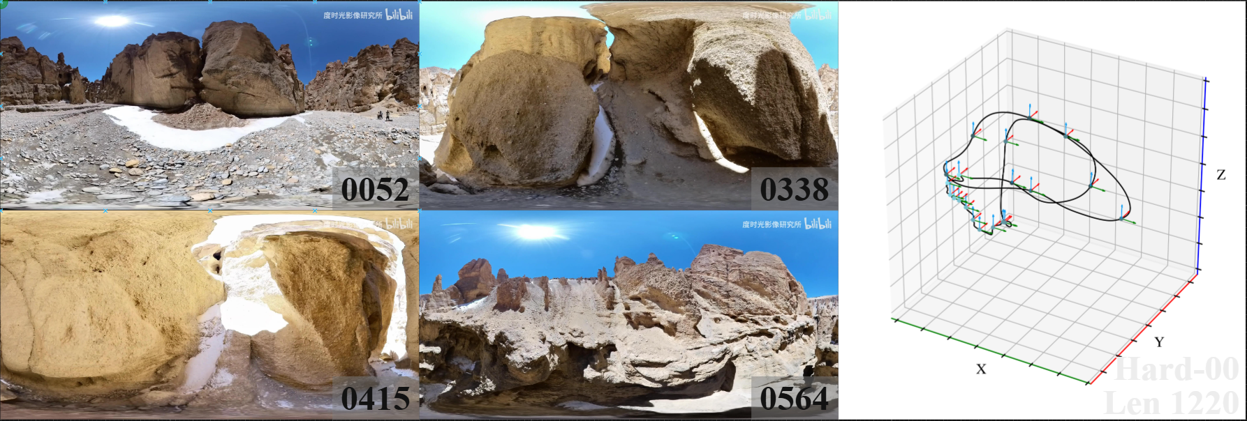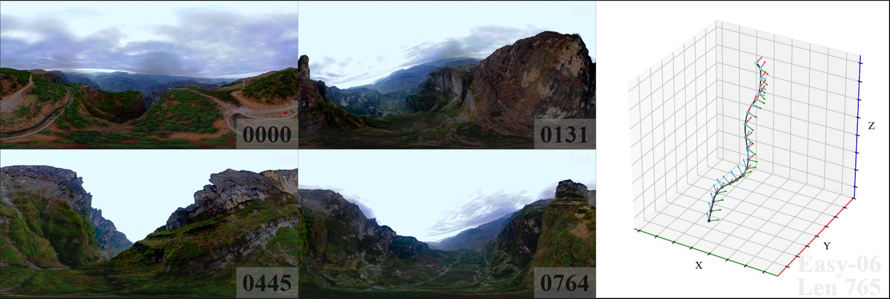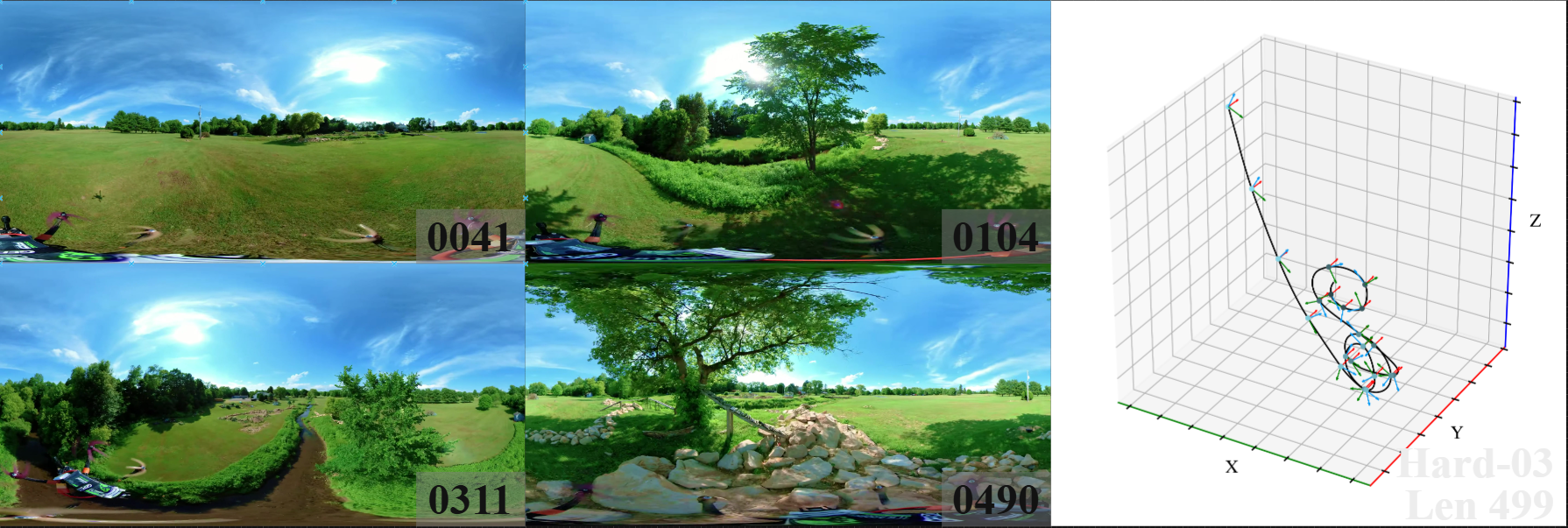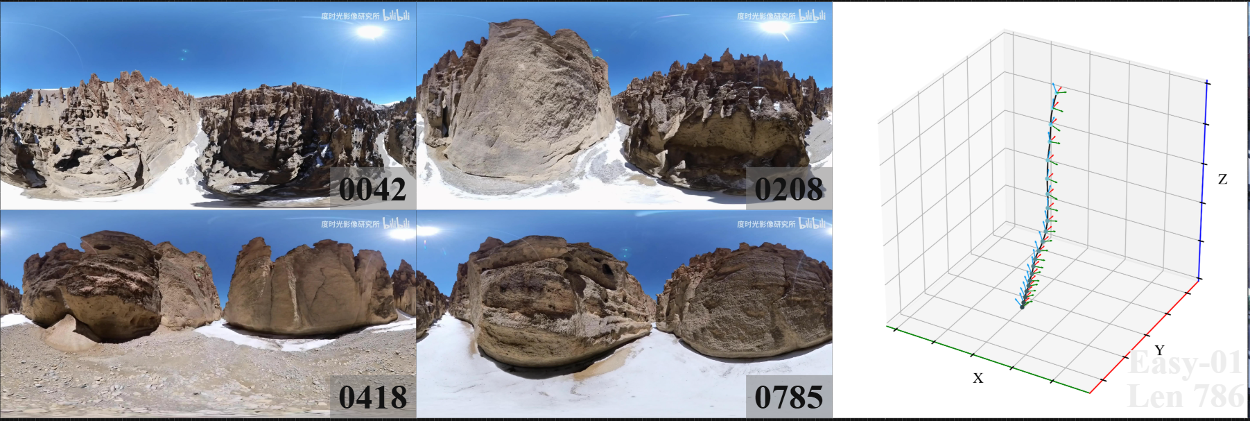 Table I: Quantitative comparison of trajectory accuracy (ATE/RPE(t)/RPE(r)) and tracking success rate (%) on the 360DVO dataset (Easy and Hard). “-” indicates failure. Best result per sequence is in red, second-best result in blue. 360DVO (fast) denotes the modification of using lower resolution images as input while maintaining sparser sampling patches. All results are shown with 2-decimal precision for clarity.