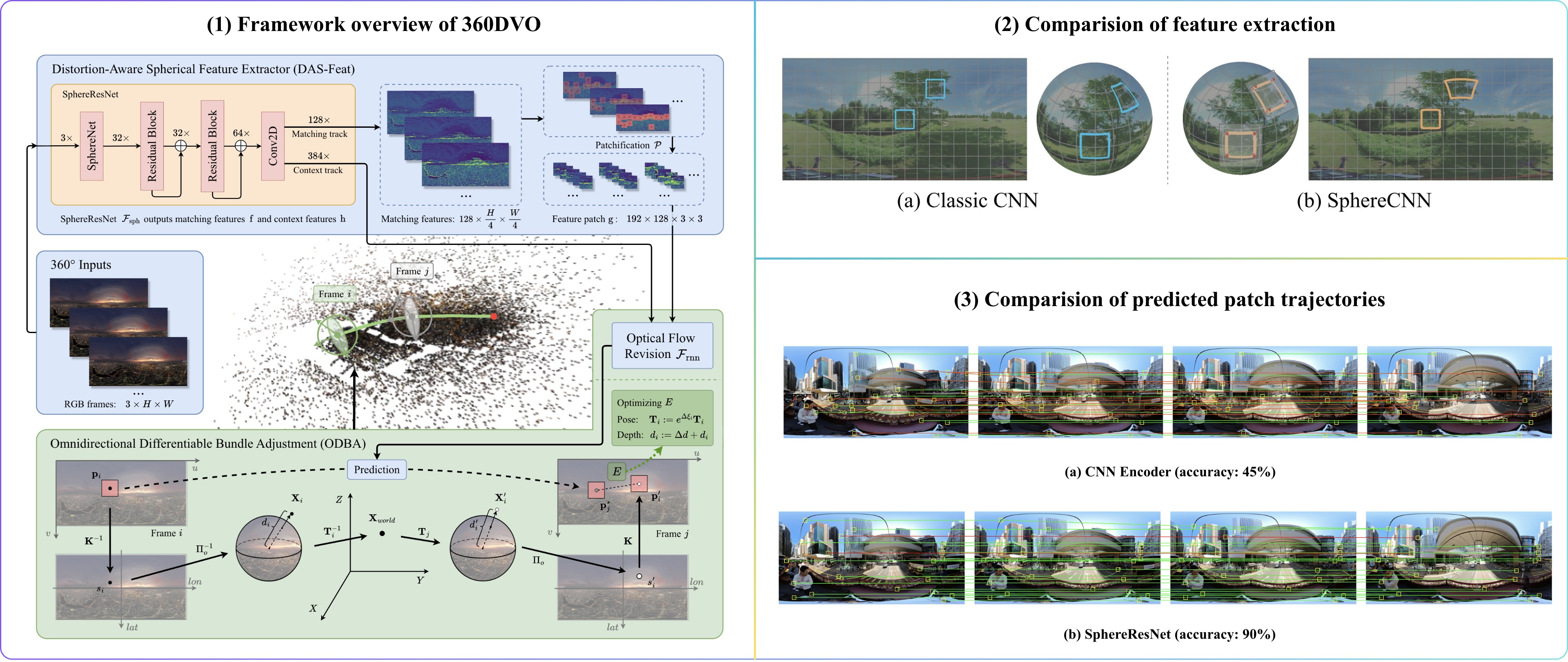 Our method takes sequential 360-degree RGB frames as input and extracts matching features and context features using our proposed DAS-Feat module on each of them. In DAS-Feat, the key component SphereResNet extracts distortion-resistant features, allowing patches to be cropped without deformation. After patchifying the matching features around their gradient maxima, we compute the correlation of patch features and context features and estimate optical flow through a recurrent network. In the ODBA module, the pose and depth of current frame are jointly optimized by minimizing the distance between predicted patch (from optical flow) and reprojected patch on the adjacent frame.