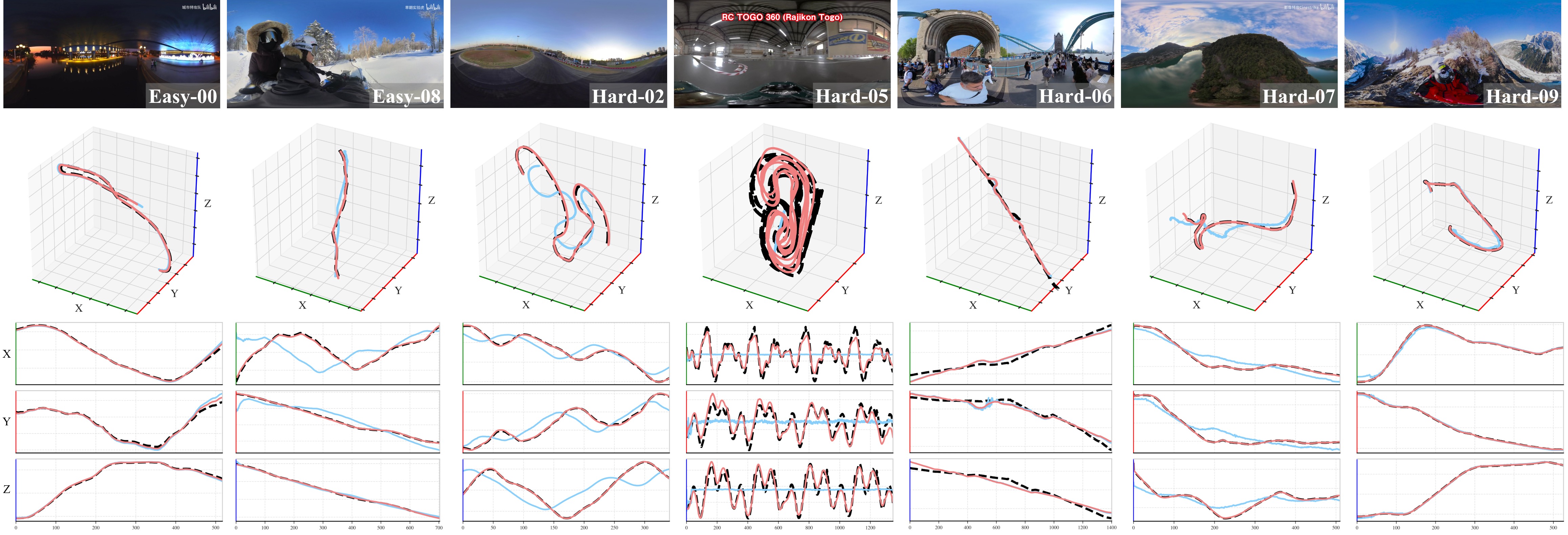 Figure II: Trajectories Comparison on the 360DVO dataset in 3D space, with position variations along the X, Y, and Z axes plotted over all frames. The ground truth is shown in black dashed lines, 360DVO results in red solid lines, and OpenVSLAM results in blue solid lines.